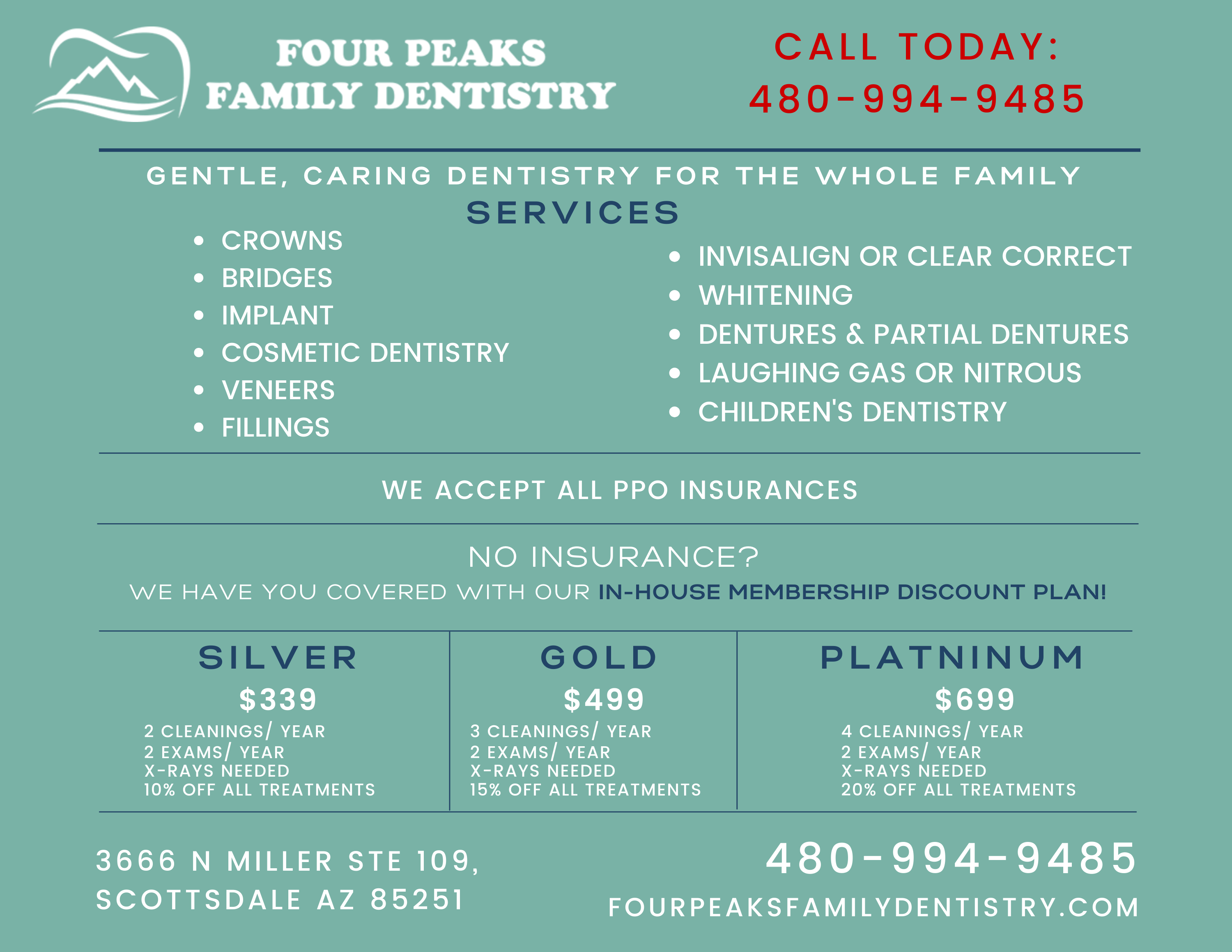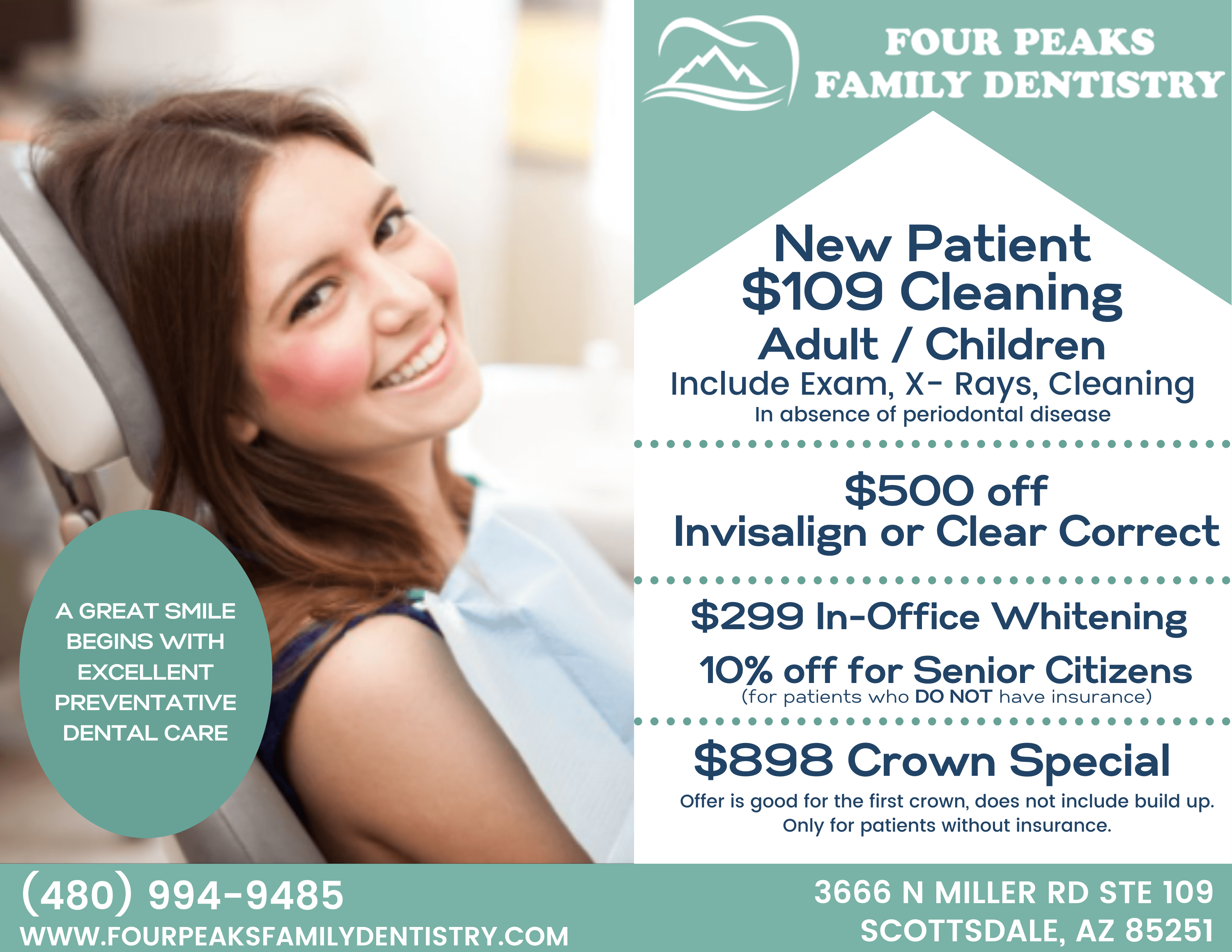 Here at Four Peaks Family Dentistry, we believe that a smile tells a thousand words, and we are dedicated to giving our patients high-quality dental care. We offer a full range of dental services, so all of your family’s needs are met under one roof.